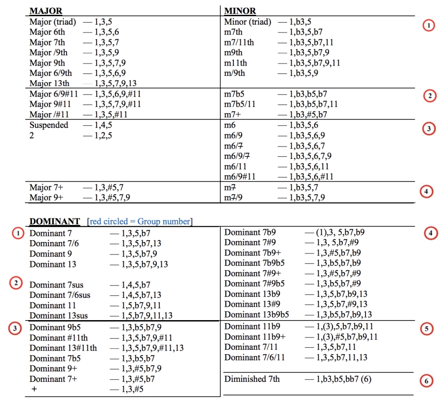 3) Group 3 is a unique group of sounds – all these sounds have a strong affinity to one of the two whole-tone scales and also to a melodic minor scale. There are different types of sound within this group: one type includes the + [augmented], 7+, 7b5, and 9+. This type can often be used to replace a dominant 7th functioning as a V7 (or V of V, etc.). The other type includes the 9b5, #11, 13#11, and 7b5 again. These all have notes which are within a melodic minor scale whose root is a 5th higher (like A13#11, #11, 9b5, 7b5 are in the E melodic minor scale). These chords work well on the following degrees: