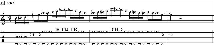Lick 3 and 4 are variations of the same idea; they are quite similar to each other but comprise of a different ending. Again, use your creative thinking! This lick is strictly chromatic throughout and uses strict alternate picking. One of the hardest points to learn when playing chromatic licks is the chord(s) to which they are to be played over. Think; beginning and end, i.e. the note to which you start the lick and the note in which you end the lick!