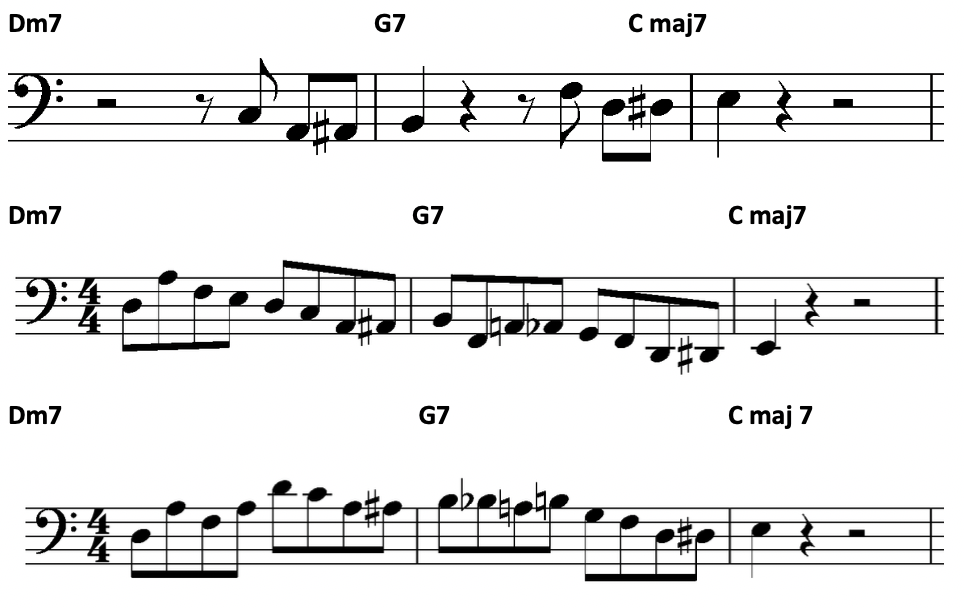 In my previous article entitled “Guide Tones” we learned how to create lines using guide tones that resolve from one chord to the next. The third degree of the chord is important because it defines whether the chord is major or minor. The seventh degree also defines a major, minor, or flat 7th for dominant 7th chords. Please review my previous article before moving on. Your goal is to be able to create melodic lines that use guide tones that resolve from one chord to the next in a smooth, flowing fashion.