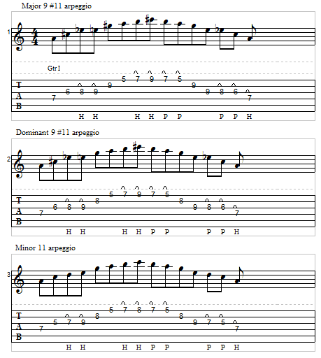 If you want to go crazy with the additions you can in addition to the ninth add the eleventh as well. Just add the eleventh to all of the minor ninth arpeggios and a sharp eleventh to all the major and dominant arpeggios, being sure to leave the diminished alone. This will take the sound to a whole new level, and make triads seem downright bland in comparison. Now I am not saying that I don't think triads sound good but the extended arpeggios have the whole elegant sophisticated thing going on. I don't think that is a bad thing. Check em' out!
