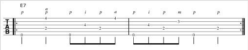 Here is an E7 chord vamp from the video that accompanies this article, for you to hone your new found fingerpicking skills: