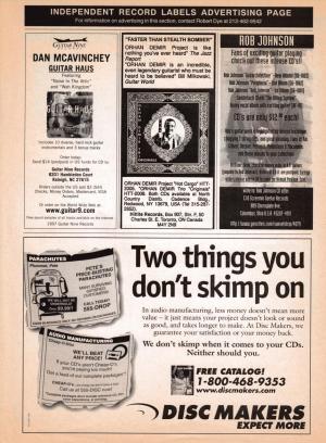 A selection of Guitar Nine (former Guitar Nine Records) print ads from 1997 through 1999. Some of you may remember Guitar World magazine's Independent Record Labels Advertising Page, managed by Robert Dye, which offered bargain rate advertising for small labels in the late 1990's. Advertising here allowed Guitar Nine to both sell records directly and bring more traffic to the web site.