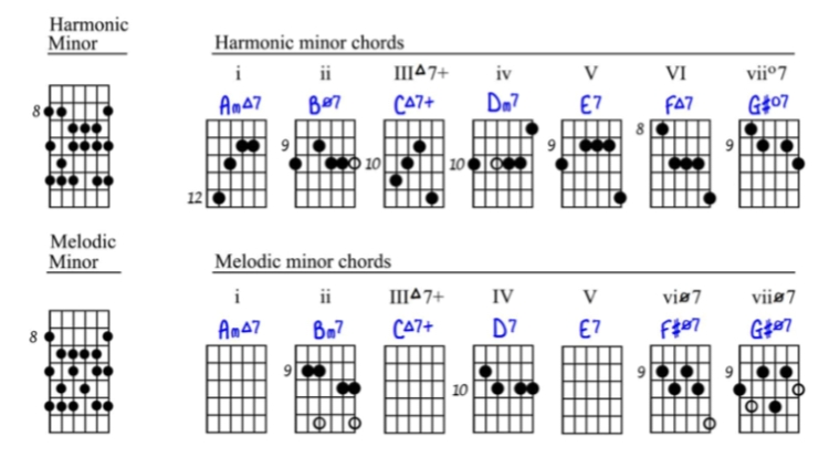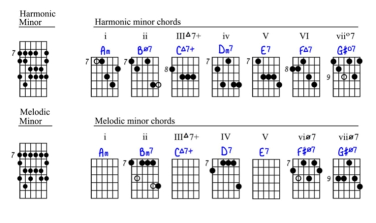Examples are in the key of A minor (Am).