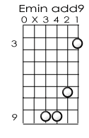 Now we are getting into uncharted territory. While the first chord is pretty much playable with a little work, the next chord, the min add9 voicing, is a real chore. Remember, relax. Just move your first finger down a fret for the second chord. The minor 2nd between the second and first strings in the Emin add9 chord make this voicing super dark sounding.
