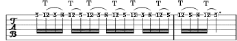 Up to now we have worked only with scales. A whole new world opens up apply our little sequence to arpeggios. The distance between notes (if we are playing them on the same strings) becomes now quite too much for the left hand, so we have to call our right hand in to help with some tapped note. Here's how an Am arpeggio can be played: