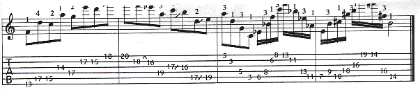 The last line, Example 5, is constructed mostly with 6ths and perfect 5th intervals. In bar one we have a F Major scale (F G A Bb C D E). Moving in Major 6th intervals (except beat 4), we have A minor 6th. In bar 2 over the G7(#5) chord we use the notes from a G Mixolydian (b6) scale, which is (1, 2, 3, 4, 5, b6, b7), except for the E natural. This scale is melodic minor's fifth mode. In bar 3 we have a perfect 5th pattern that moves up the neck in intervals. In bar 4 over the A Major 13th chord we are using notes from an Ab minor pentatonic (Ab B Db Eb Gb) scale. This gives us an A Lydian sound.