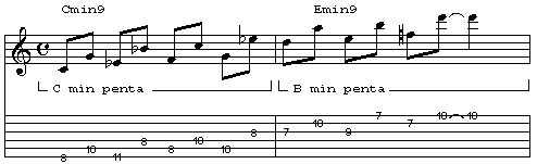 Let's start by using what we have learned over an all minor chord progression. This chord progression is a simple two chord vamp of a Cmin9 and a Emin9 chord for four bars each. Again, I tend to pick the pentatonic scales that are close to each other so I can connect motifs over the barlines: