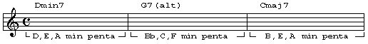 n this example I use the same intervalic motif as our first example but this time starting on an E minor pentatonic scale, moving up a half step for the G7(alt) chord and resolving it by moving back to the E minor pentatonic scale: