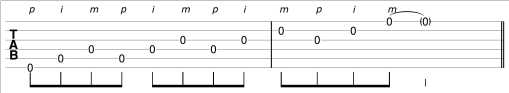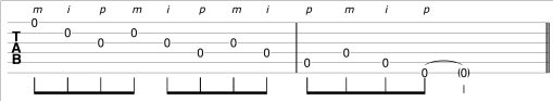 When ascending the pentatonic scale with this open string approach, your picking hand will be using what's known as a forward banjo roll. This is a rotating fingerpicking pattern that uses your thumb (p), index (i), and middle (m) fingers across adjacent strings: